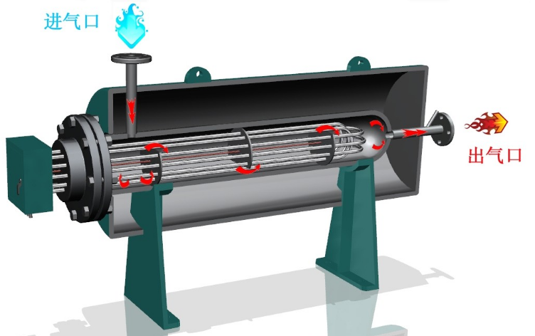 首先給大家講解一下空氣電加熱器的工作原理,加熱的氣體經(jīng)送風(fēng)機(jī)或進(jìn)氣閥進(jìn)入到加熱艙的換熱艙,再經(jīng)過加熱管加熱并在換熱艙內(nèi)充分換熱達(dá)到所需的溫度時,從出氣口出來。出氣口上裝有溫度傳感器,專門用來采集溫度信號傳給控制系統(tǒng),再由控制系統(tǒng)控制加熱器的功率輸出,以達(dá)到自動控溫。在換熱艙內(nèi)亦裝有溫度傳感器,主要用于監(jiān)測加熱管的溫度,當(dāng)加熱管超溫或超出設(shè)定溫度范圍時,自動切斷電源,停止加熱。