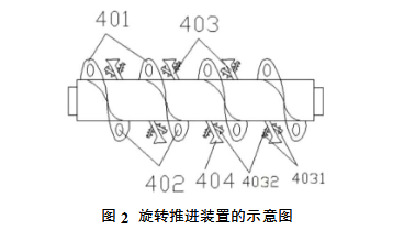 如圖1所示,本脈沖布袋除塵器用的二次除塵裝置,包括設(shè)置在脈沖布袋除塵器下箱體底部的導(dǎo)管2,還設(shè)有噴淋裝置3、旋轉(zhuǎn)推進(jìn)裝置4和出漿管5,導(dǎo)管的出口端與旋轉(zhuǎn)推進(jìn)裝置進(jìn)料端連接,在導(dǎo)管與旋轉(zhuǎn)推進(jìn)裝置的連接處還設(shè)置有噴淋裝置,噴淋裝置的噴水口穿過(guò)導(dǎo)管內(nèi)壁并朝向旋轉(zhuǎn)推進(jìn)裝置的輸送料腔內(nèi),在旋轉(zhuǎn)推進(jìn)裝置出料端連接出漿管;如圖2所示的旋轉(zhuǎn)推進(jìn)裝置4包括輸送料筒、設(shè)置在輸送料筒內(nèi)的傳動(dòng)軸以及帶動(dòng)傳動(dòng)軸旋轉(zhuǎn)的電機(jī),在傳動(dòng)軸上設(shè)有帶漏料孔402的螺旋葉片401,螺旋葉片之間還設(shè)置有攪拌棒403,攪拌棒403一端與傳動(dòng)軸固定連接,另一端設(shè)置清除輸送料筒內(nèi)壁灰塵的刮刀404;所述的噴淋裝置上還設(shè)有進(jìn)水開(kāi)關(guān);所述的旋轉(zhuǎn)推進(jìn)裝置出料端設(shè)置有噴淋裝置;所述的傳動(dòng)軸兩側(cè)均設(shè)置攪拌棒403,且刮刀404與攪拌棒403之間的角度為75-135°。